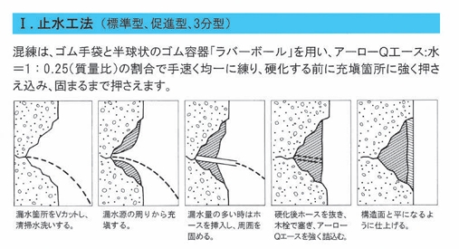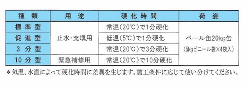 収縮が極めて少なく、接着性、防水性に優れ、止水、充填、補修、緊急工事に最適です。